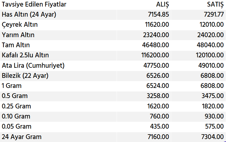 Biga piyasasından edinilen bilgilere göre, 24 Ayar Has Altın alış fiyatı 7.154,85 TL olarak belirlenirken, satış fiyatı 7.291,77 TL seviyelerinde seyrediyor. Özellikle küçük yatırımcının gözdesi olan 24 Ayar Gram Altın ise 7.304,00 TL’den alıcı buluyor.