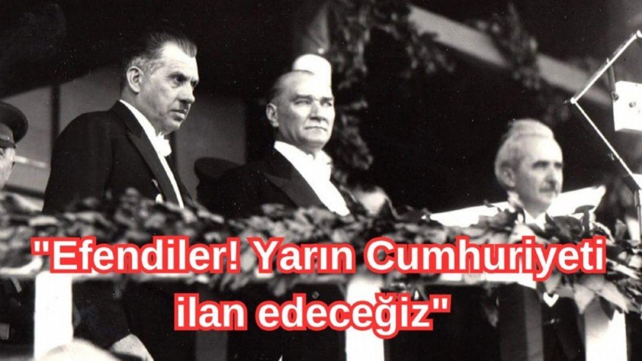 Yemek sırasında: 'Yarın Cumhuriyet ilan edeceğiz' dedim. Orada bulunan arkadaşlar, derhal düşünceme katıldılar. Yemeği bıraktık. O dakikadan itibaren, nasıl hareket edileceği konusunda kısa bir program yaparak arkadaşları görevlendirdim. Yaptığım programın ve verdiğim talimatın uygulanışını göreceksiniz.