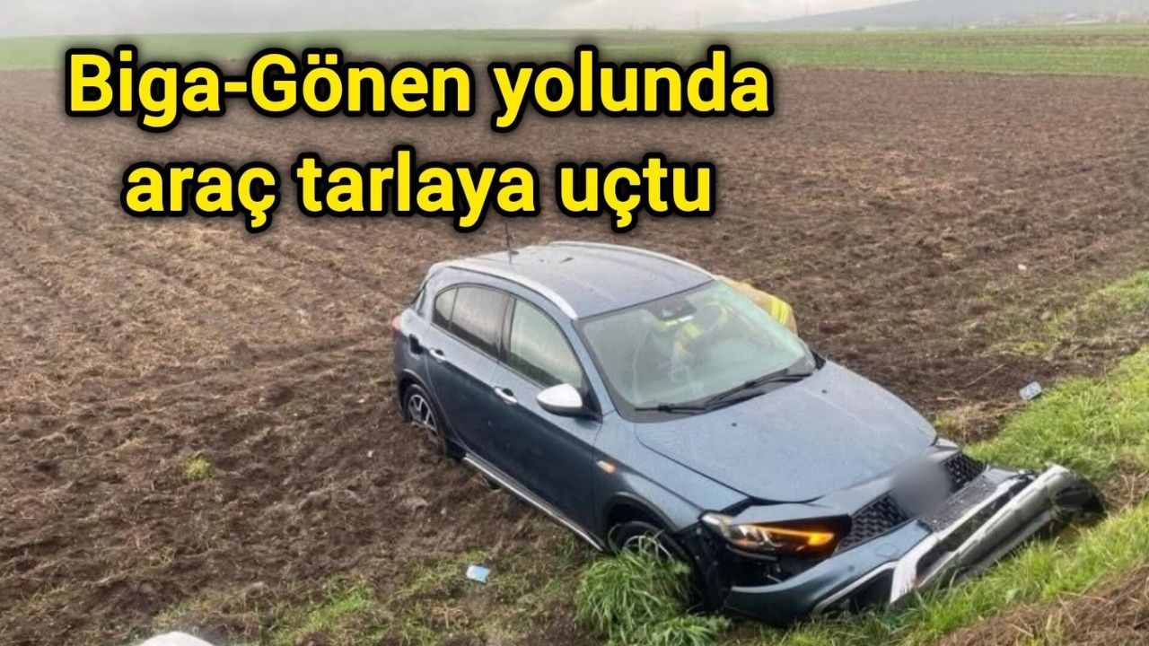 Edinilen bilgilere göre, Biga-Gönen yolu üzerinde meydana gelen trafik kazasında, yağış nedeniyle kayganlaşan yolda kontrolünü kaybeden bir otomobil, tarlaya uçtu.