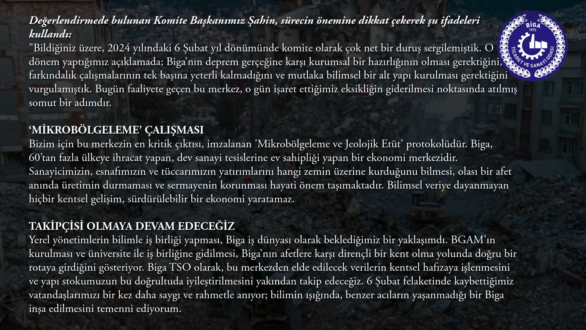 Biga TSO, üyelerin ve halkın güvenliği için atılan tüm bilimsel adımların destekçisi ve kamuoyu nezdinde takipçisi olmaya devam edeceğini beyan ederek, depremde hayatını kaybeden vatandaşları bir kez daha rahmetle andı.