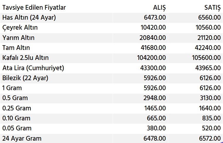 • 0.25 Gram Altın: Alış 1465.00 TL, Satış 1640.00 TL.