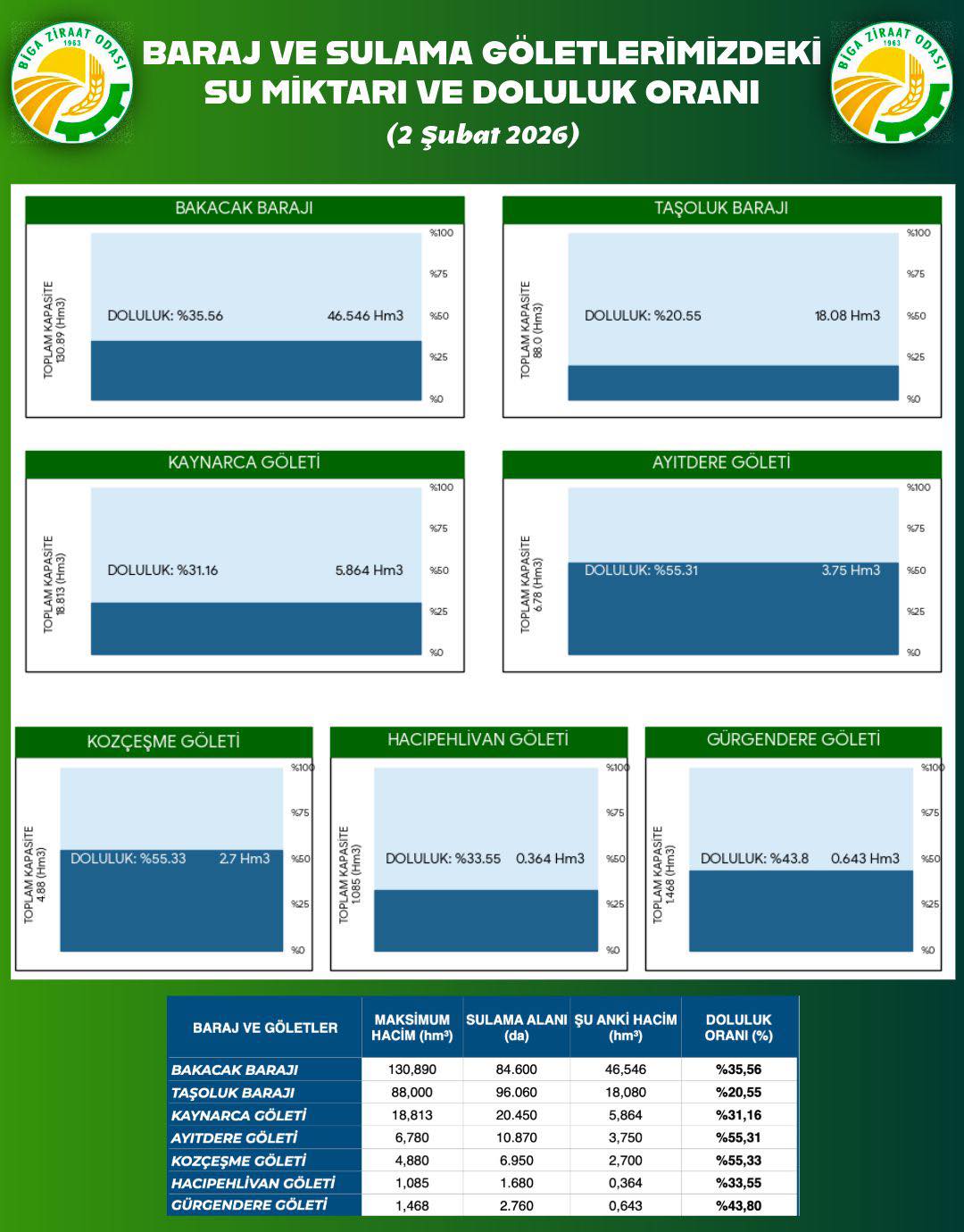 Biga Ziraat Odası, ilçedeki tarımsal sulama amaçlı baraj ve göletlerin 2 Şubat 2026 tarihi itibarıyla güncel doluluk oranlarını paylaştı. Yapılan açıklamada su tasarrufunun önemine dikkat çekildi.