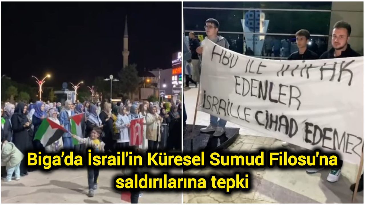Biga Belediye Meydanı’nda toplananlar, ellerinde Türk ve Filistin bayraklarıyla tekbir getirerek slogan attı.