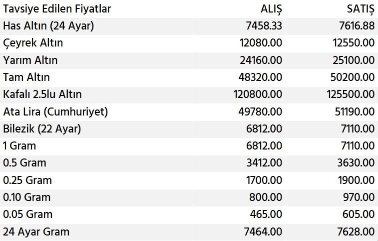 Paylaşılan güncel tavsiye edilen fiyat listesine göre; Has Altın (24 Ayar) alış fiyatı 7.458 TL seviyelerindeyken, satış fiyatı 7.616 TL'ye ulaştı. Ancak asıl şok, halk arasında "küçük altın" olarak bilinen çeyrek altında yaşandı. Çeyrek altının satış fiyatı 12.550 TL olarak listelendi.
