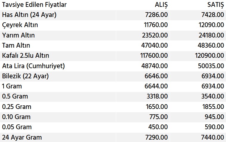 Piyasalarda işlem gören diğer altın türlerine ait tavsiye edilen fiyatlar şu şekildedir: