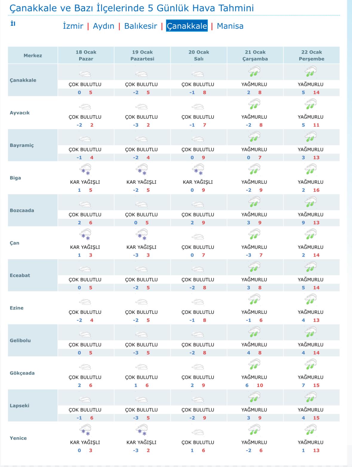 · Biga: Pazar gününden itibaren başlayacak kar yağışının Salı gününe kadar kesintisiz devam etmesi bekleniyor. Pazartesi günü sıcaklık -2 dereceye kadar düşecek.