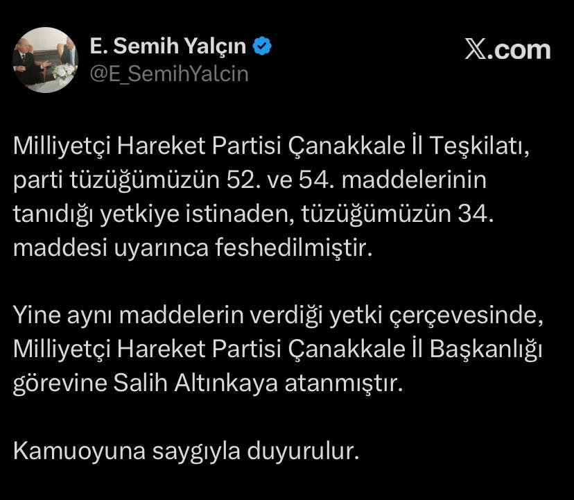 Genel Başkan Yardımcısı Edip Semih Yalçın’ın kamuoyuna yaptığı duyuruda; il teşkilatının parti tüzüğünün 52. ve 54. maddelerinin tanıdığı yetkiye istinaden, yine tüzüğün 34. maddesi uyarınca feshedildiği belirtildi. Bu kararın ardından, aynı yetki çerçevesinde MHP Çanakkale İl Başkanlığı görevine Salih Altınkaya’nın atandığı resmen açıklandı.