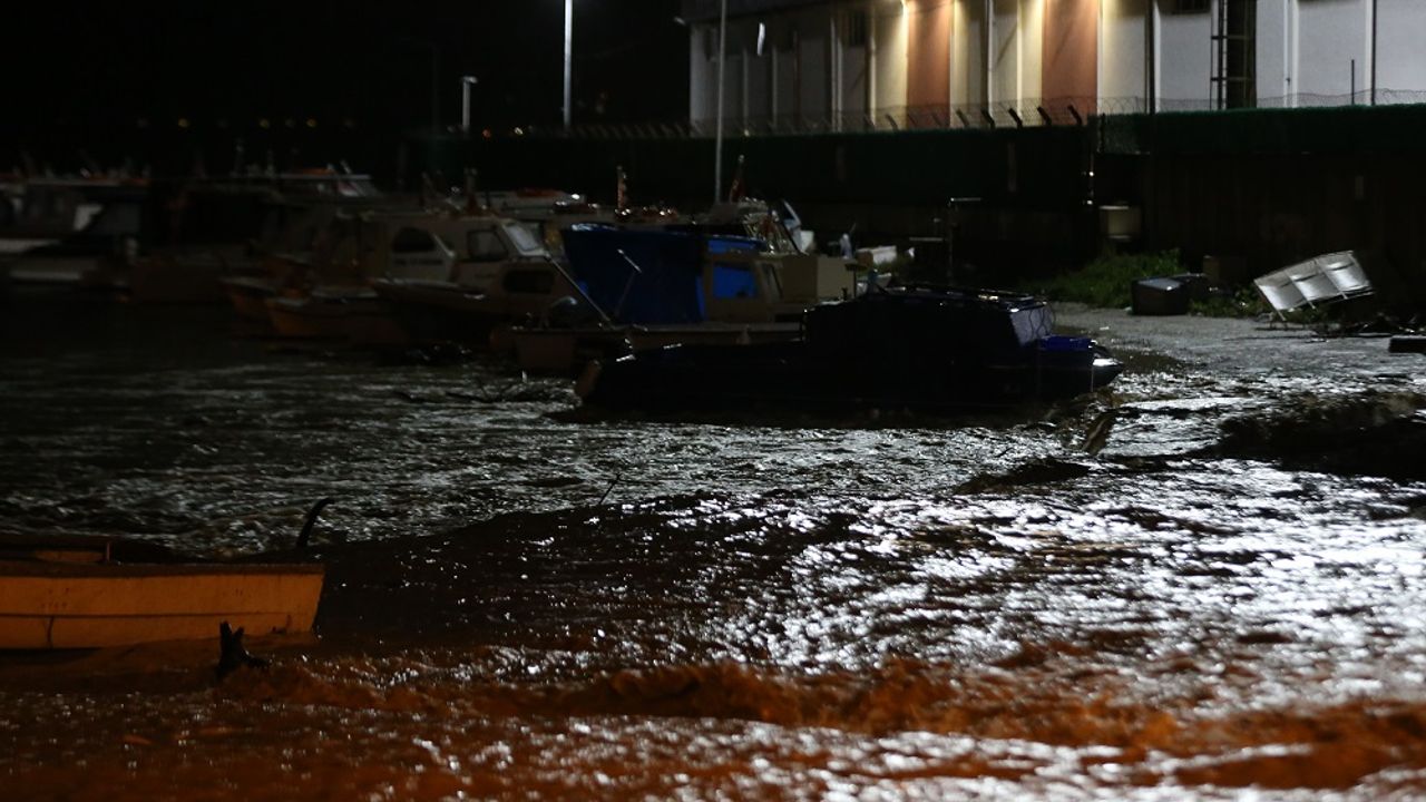 Su akışıyla taşan çay, balıkçı barınağına ulaşıp bazı teknelere zarar verdi.