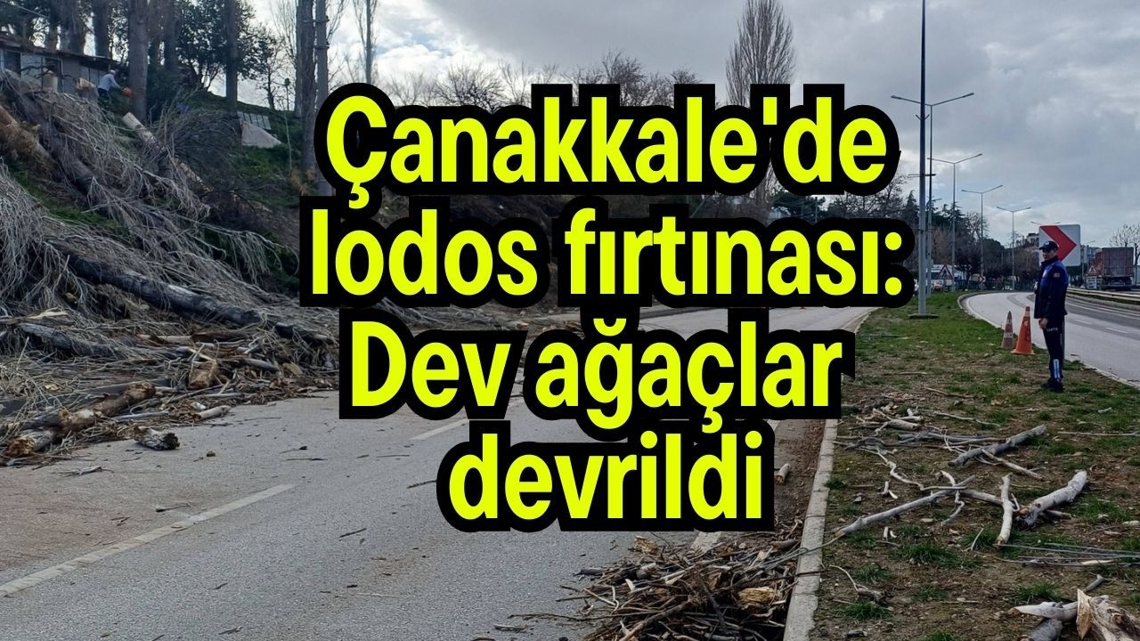 Özellikle Lapseki-Çardak yolu istikametinde yaşanan fırtına nedeniyle çok sayıda dev ağaç devrildi.