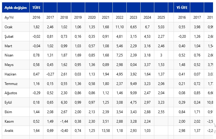 Yİ-ÜFE'de Aralık 2024'e göre yüzde 25,67, geçen yılın ekim ayına kıyasla yüzde 27 artış oldu.