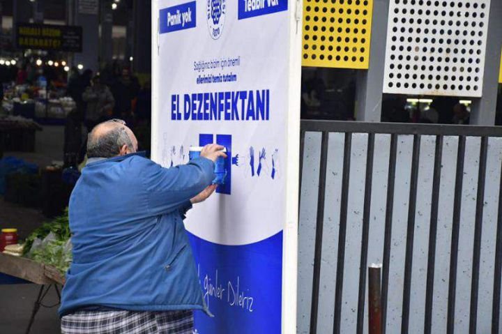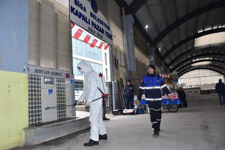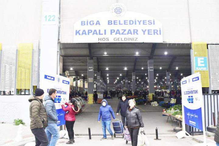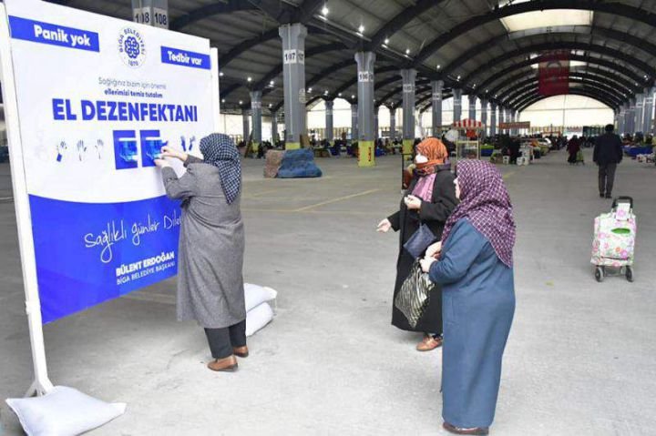 BİGA BELEDİYESİ PAZAR YERİ GİRİŞ VE ÇIKIŞLARINDA VATANDAŞLARA EL DEZENFEKTANI SIKTI