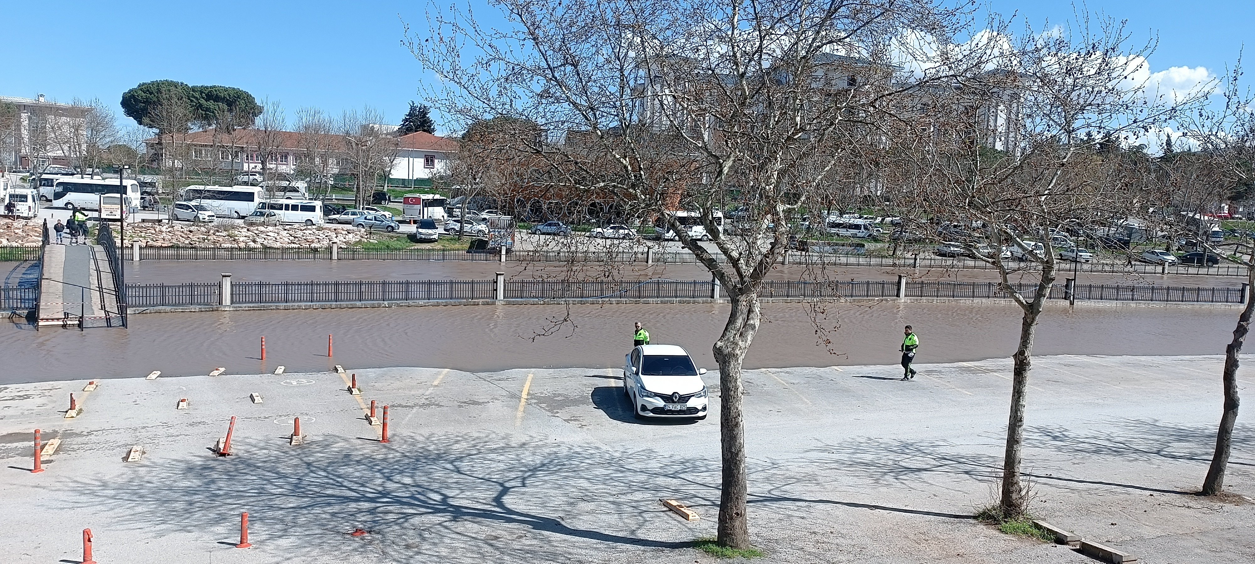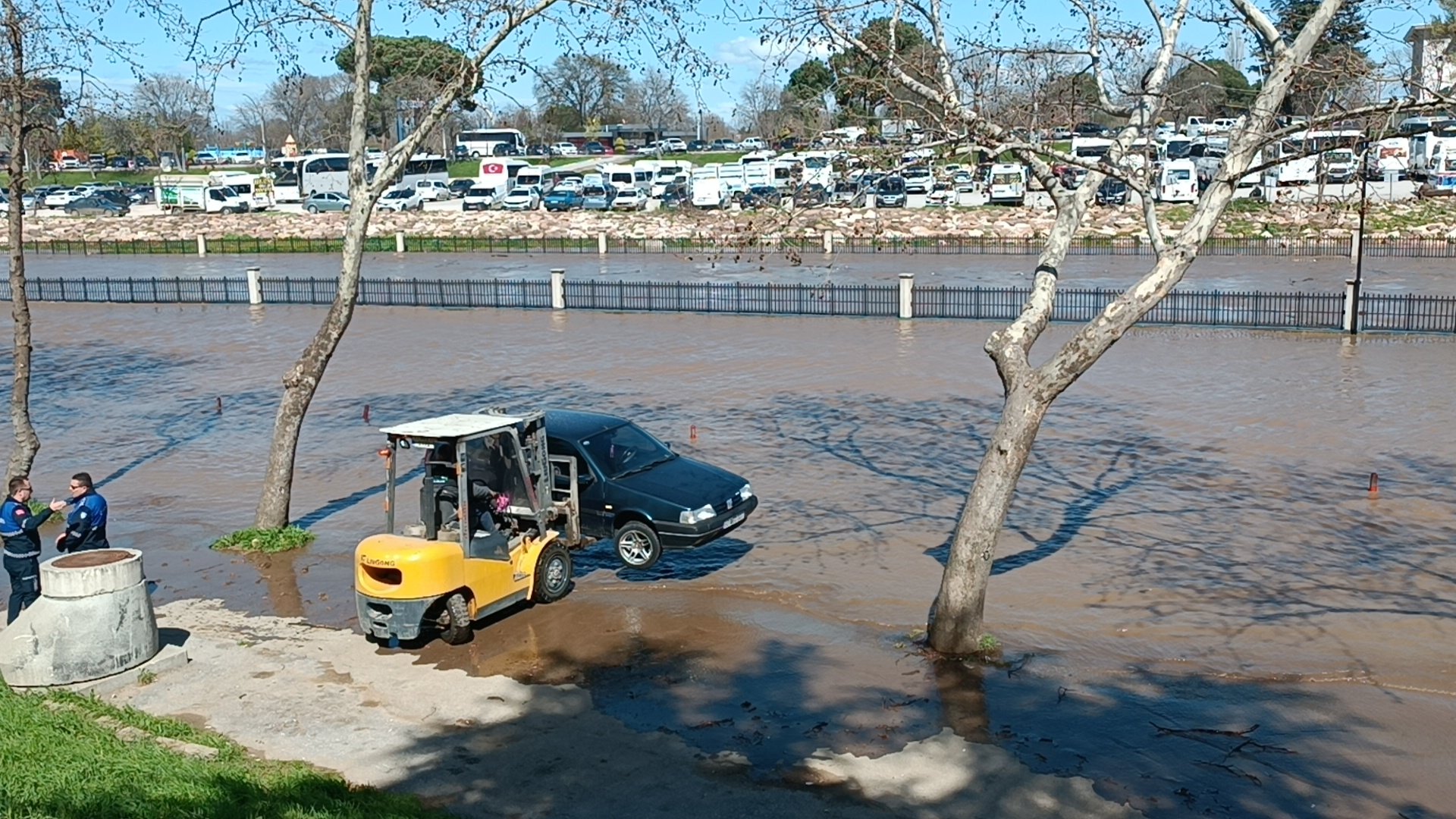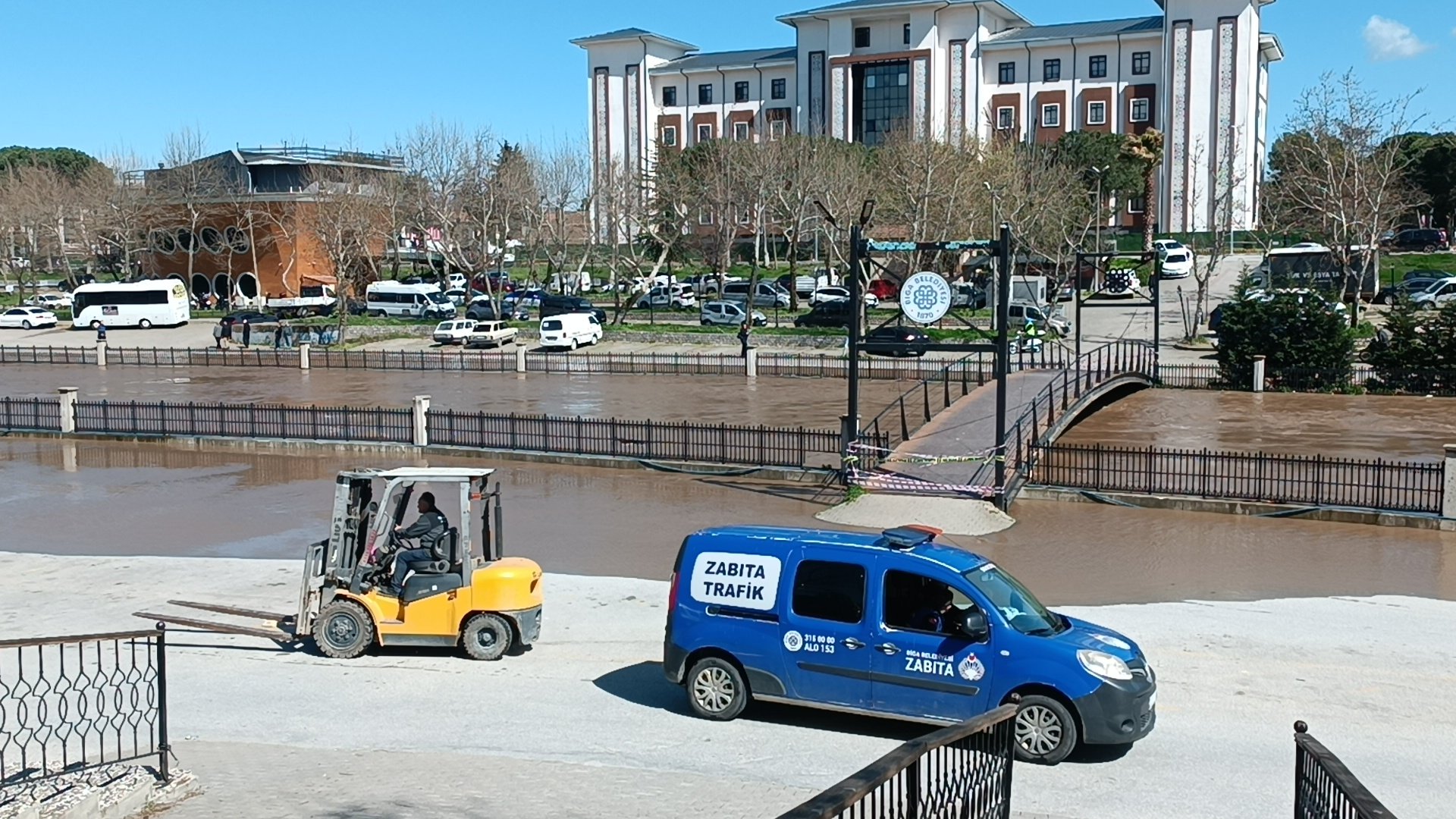 Çanakkale'nin Biga ilçesinde korkulan senaryo gerçek oldu. Yoğun yağışa dayanamayan Kocabaş Çayı, yatağından taştı. Otopark alanında kalan araçlar, sular yükselmeden hemen önce forkliftler yardımıyla tek tek güvenli bölgelere taşındı.