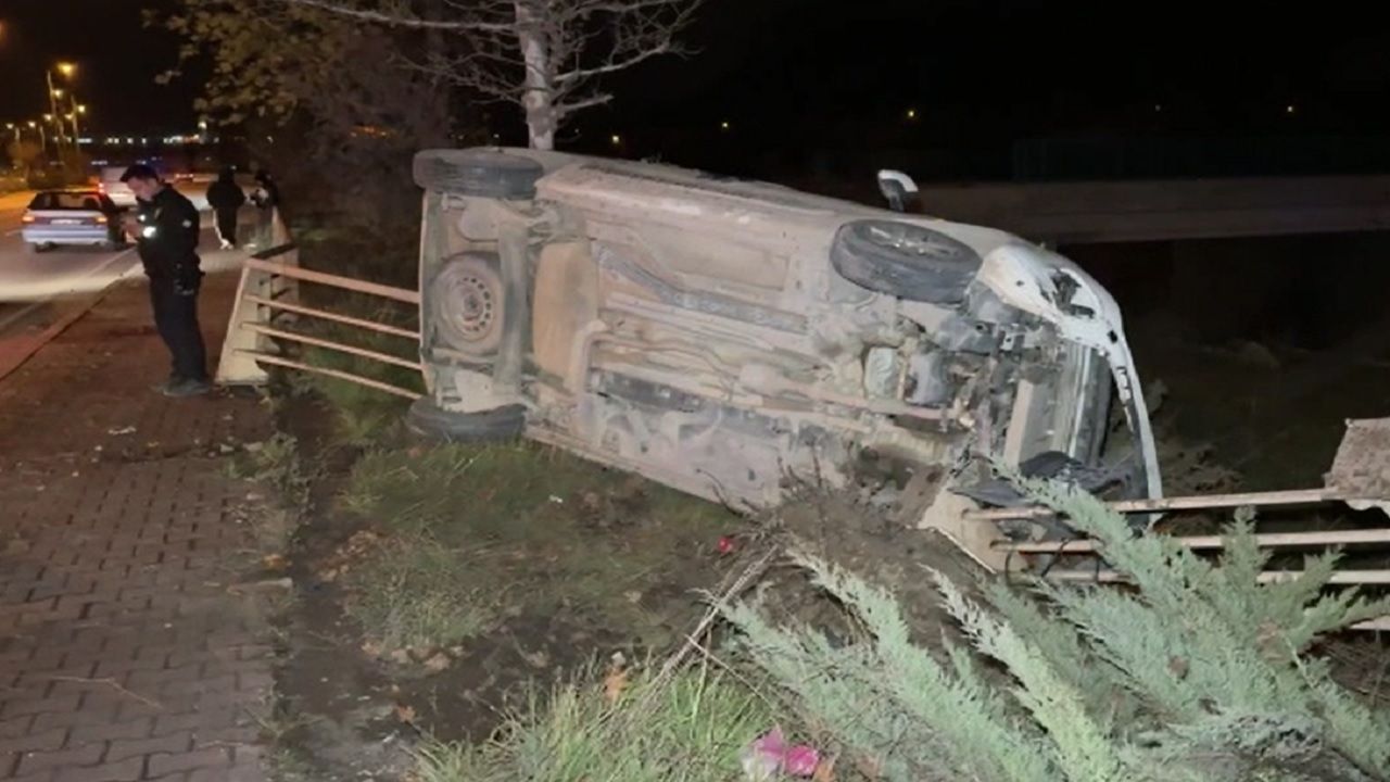 Çarpışmanın etkisiyle hafif ticari araç yol kenarına devrildi.