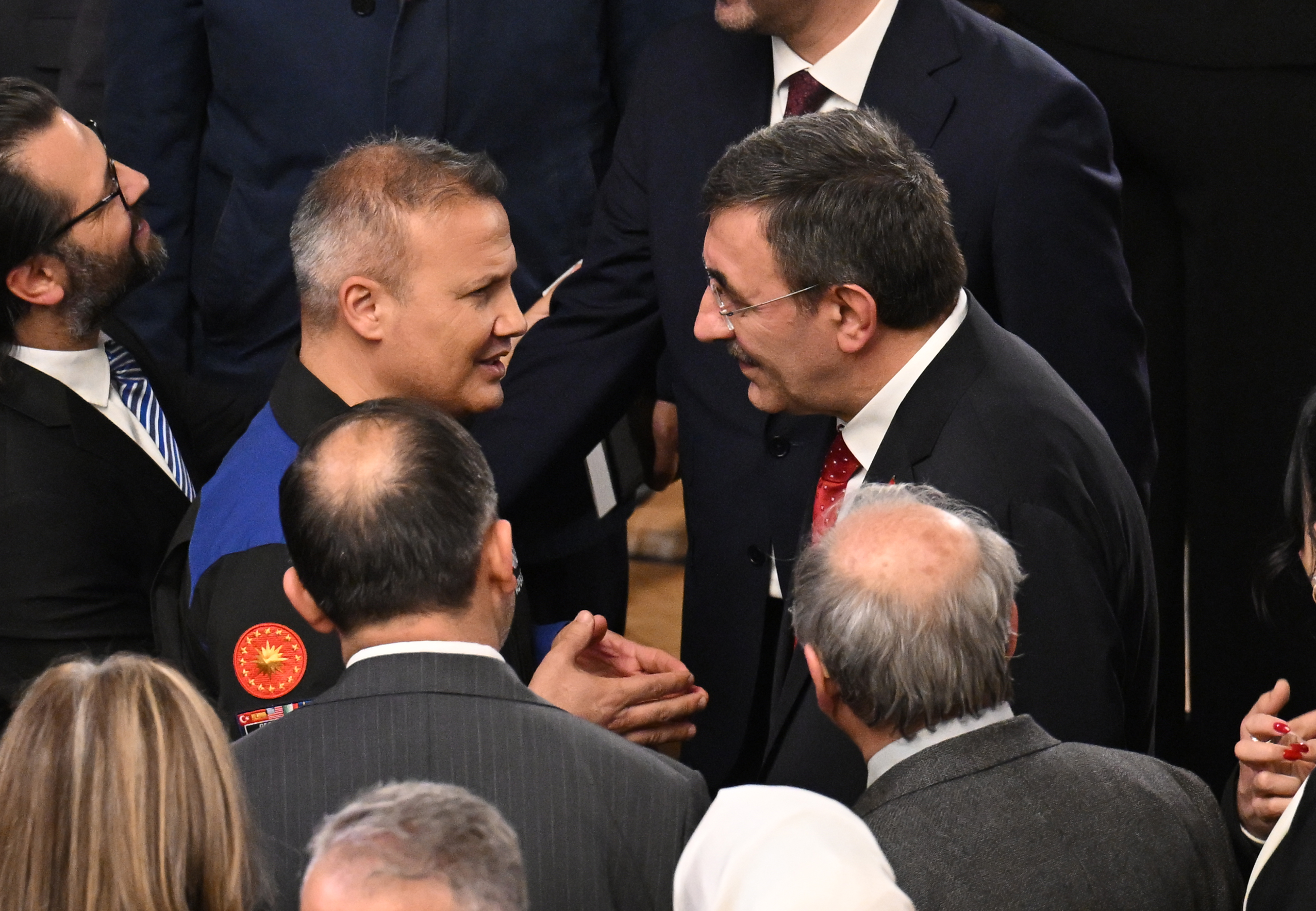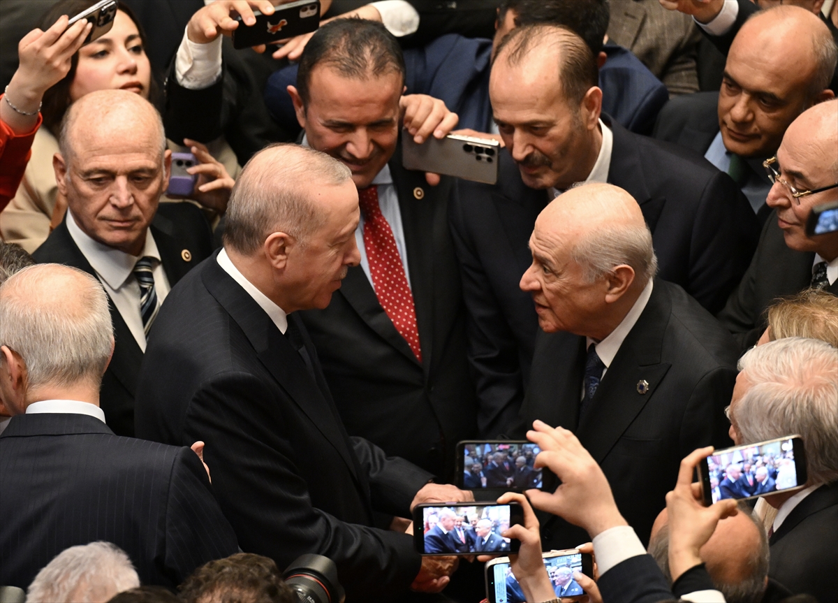 TBMM Başkanı Kurtulmuş ile Tören Salonu'nun yanında bulunan Mermerli Salon'a geçen Cumhurbaşkanı Erdoğan, burada Cumhurbaşkanı Yardımcısı Cevdet Yılmaz, kabine üyeleri ve bazı davetlilerle bir süre sohbet etti.